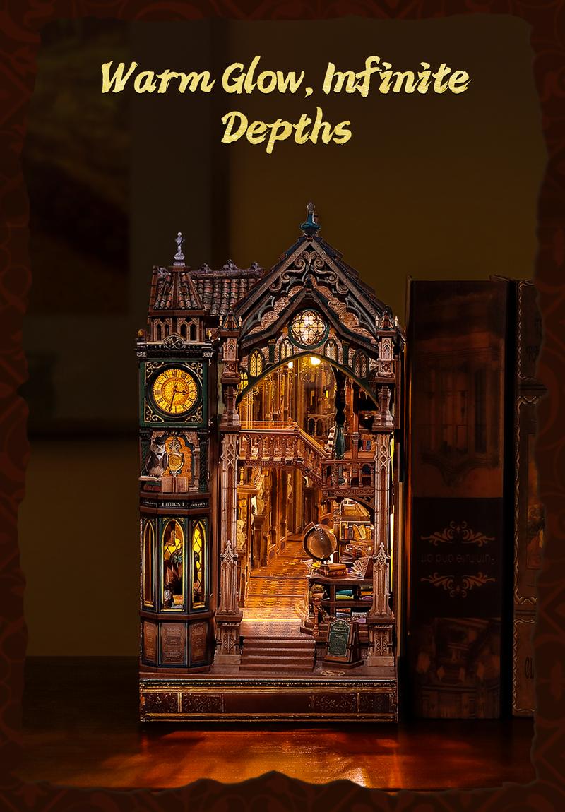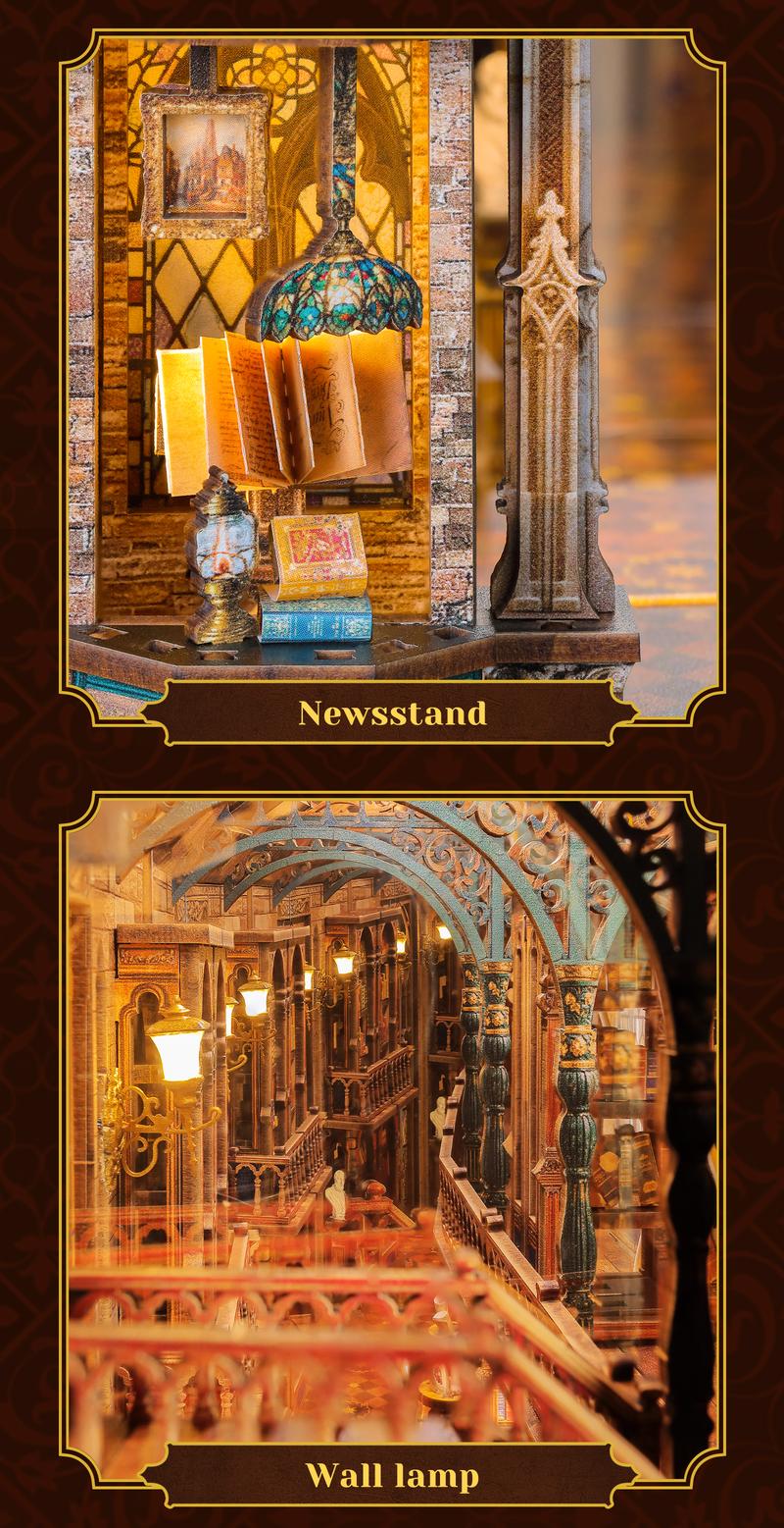Step into the Whispering Page, a book nook inspired by Gothic stained-glass motifs and classic library architecture. Once placed on your shelf, it creates a quiet, scholarly atmosphere reminiscent of a grand reading hall.