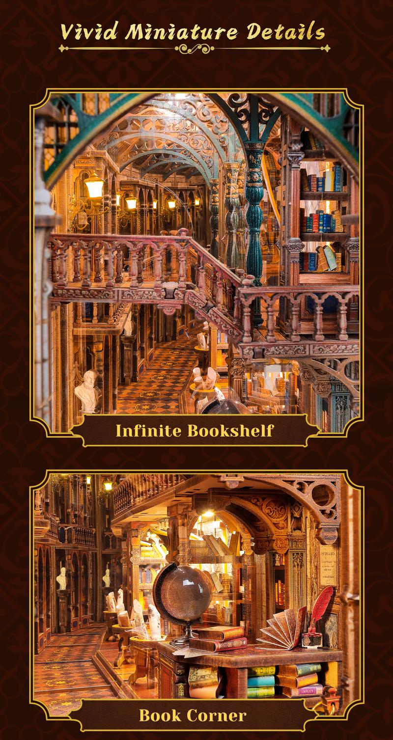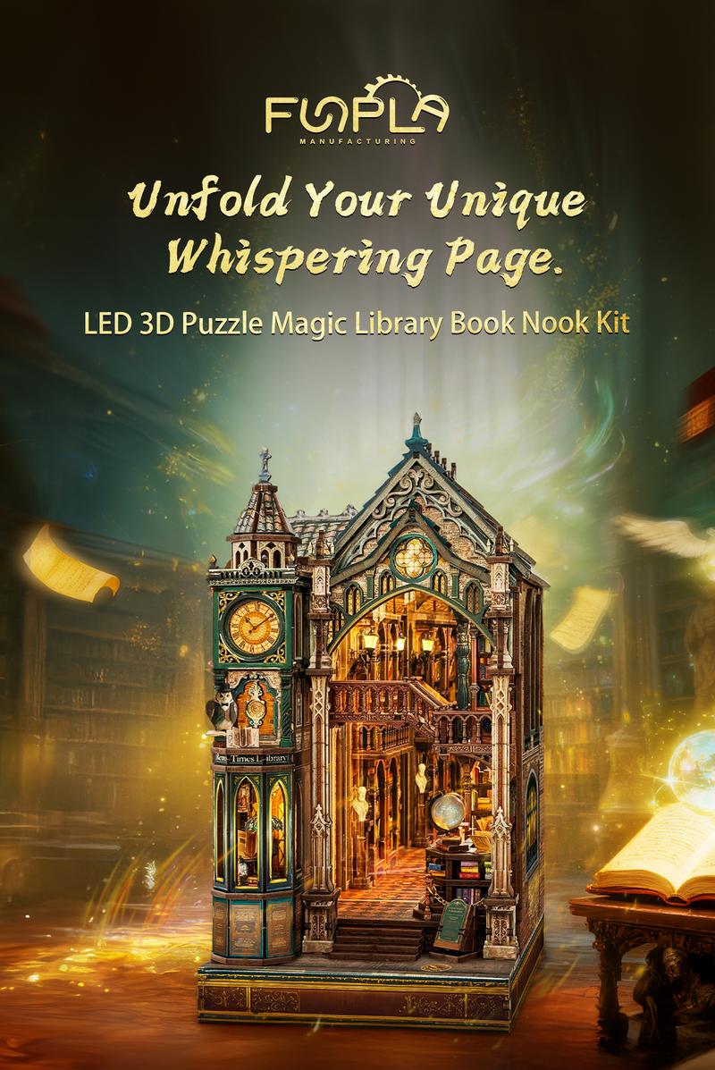 FUNPOLA Magic Library Book Nook Kit – LED 3D Wood Puzzle with Infinity Mirror – DIY Bookshelf Decor, Miniature Craft Gift for Kids and Adults
